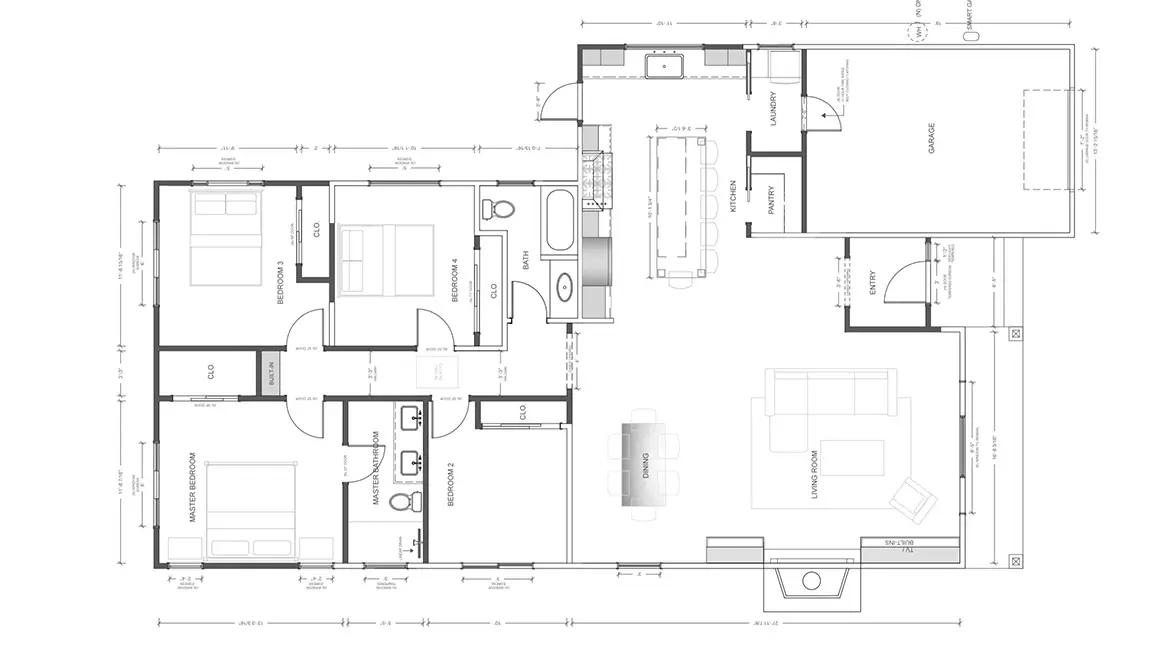 现在的目标变成了使房子在结构上尽可能坚固和持久——这意味着除了车库和浴室之外,所有东西都要拆除。Irby 从对现有布局的测量开始每个项目,然后在 AutoCAD 中绘制三个或四个不同的布局选项。